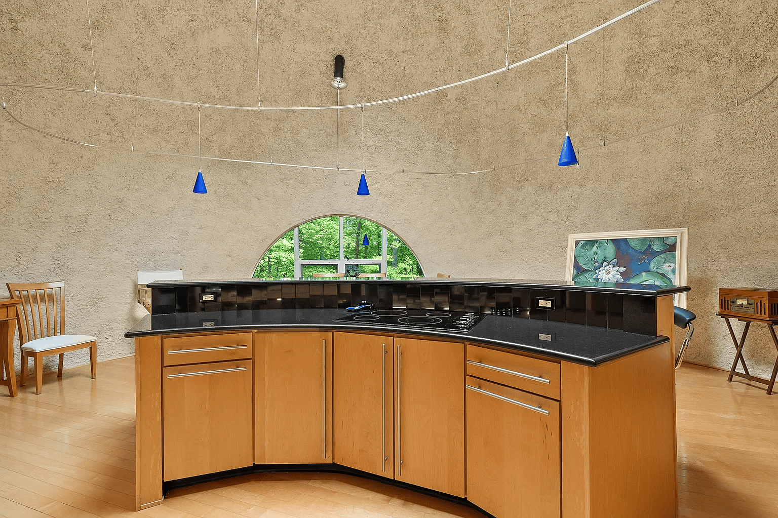 That aforementioned duality comes together in the kitchen: there’s shades of wood cabinetry, a curved island, and some tiny blue light fixtures.