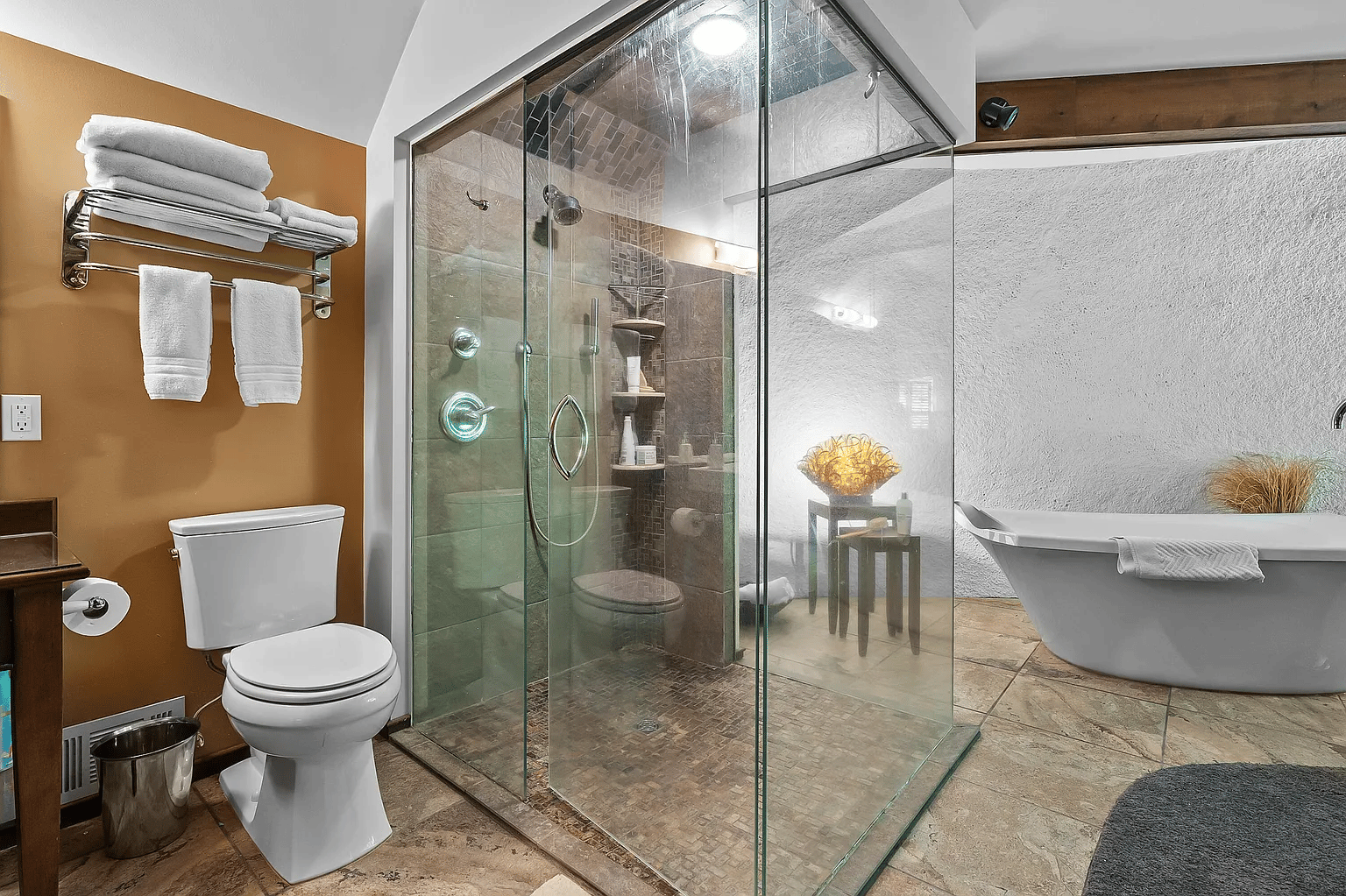 Climb up another set of stairs to the primary bedroom: it’s got space, a very old headboard/dresser, and a cool semicircle window. Nearby, the bathroom gives us a different theme: free-standing. There’s two detached mirrors, a standing sink, a standing tub, and a shower that stands in the middle of the room.