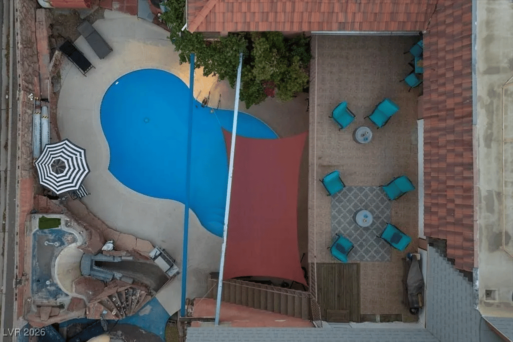 Just a reminder: we in the desert, so a pool, in any state, is imperative. Besides its funky shape, the pool is nothing special. BUT around the pool, the personality of the home shines again:
