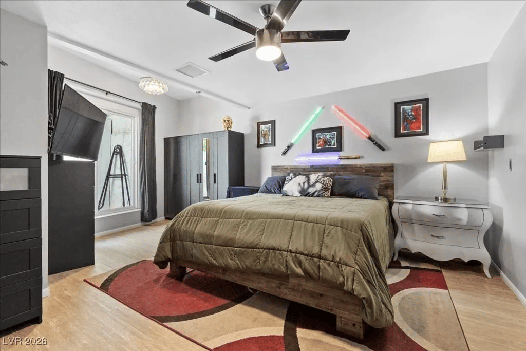 Unfortunately, of all the photographed bedrooms, this one mostly likely resembled a “primary bedroom”… which says a lot about this house. I can’t say I recall Star Wars: Revenge of the Showgirl, but maybe I’m not tuned-in enough to the fandom.