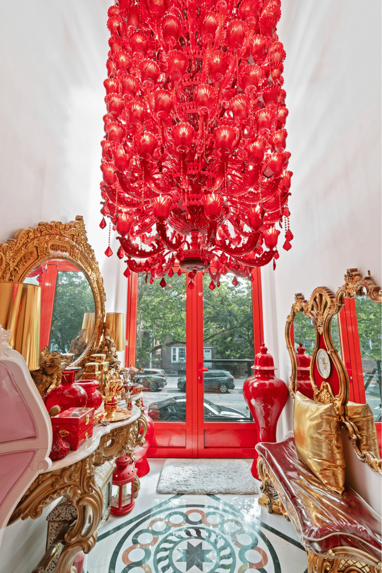 Entering the home on the 2nd floor, there’s so much to take in -and that’s the best part! From the bold front door, custom flooring, and gold accented furniture, the details have not been left behind. And that long, red chandelier strikes your attention, inviting you to bask in the colorful glory of this home.