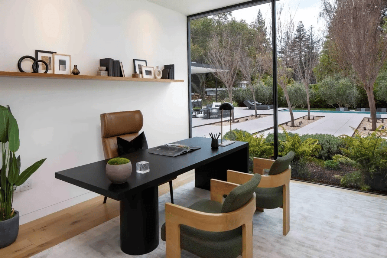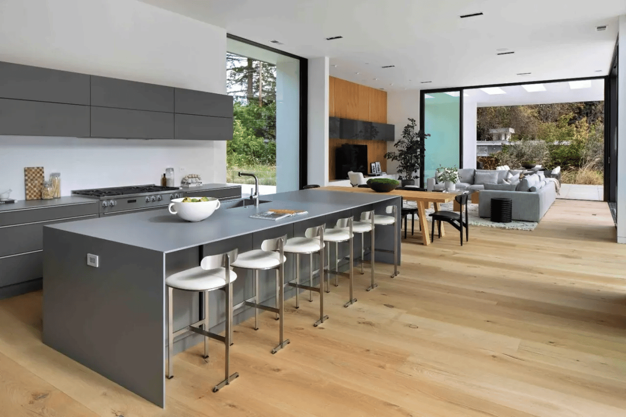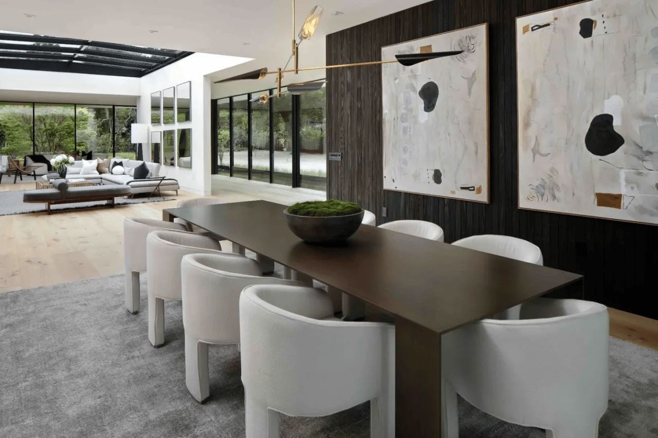 Once he lands in this home, he’ll notice more sleek design work with the dining table, round chairs, and general open concept.