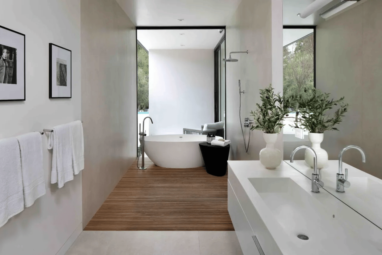 Outdoor access via the floor-to-ceiling window-door next to the bathtub?! This would be ideal for a quick reindeer wash.