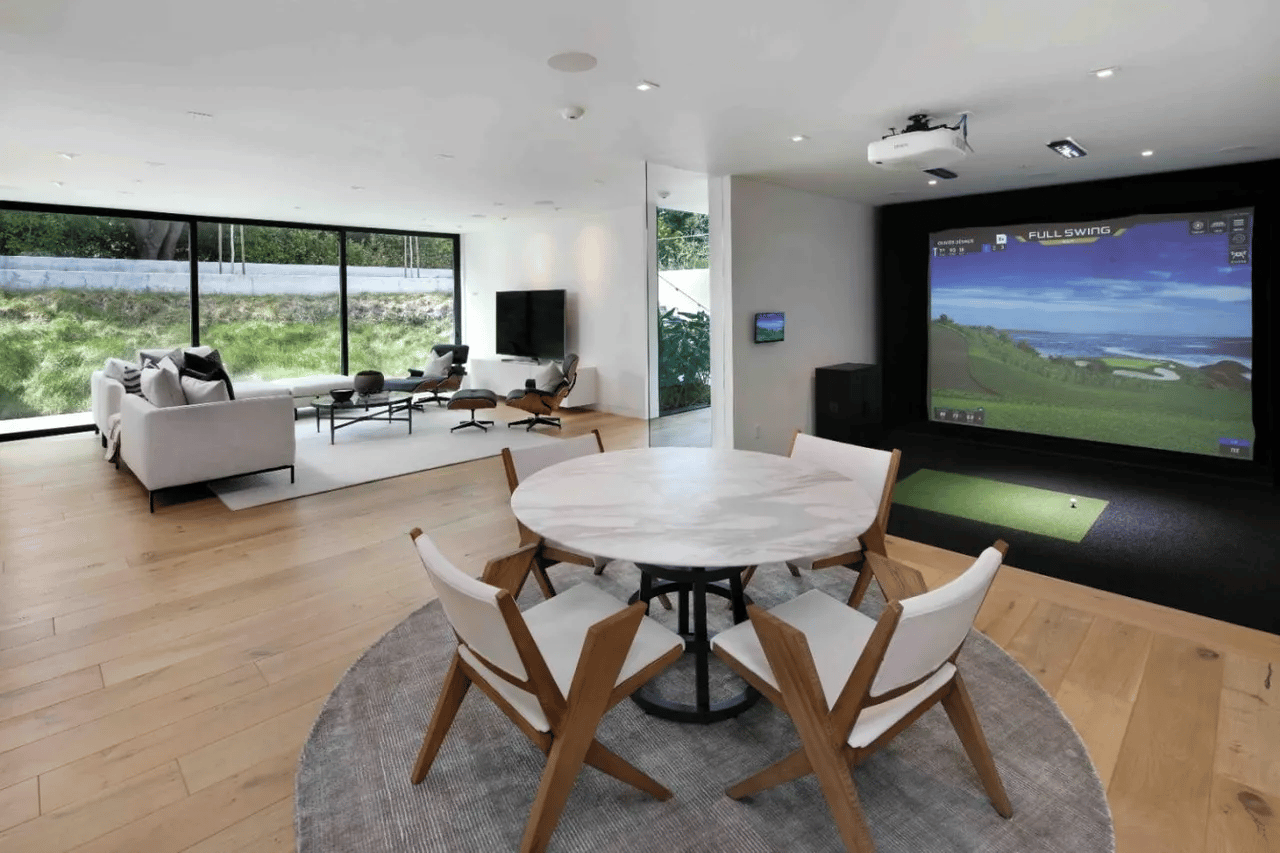 Evidence of Santa’s last trip can be found in this recreational space: a full golf simulator and pilates home gym. And, if he provided it, I can assume he likes it.