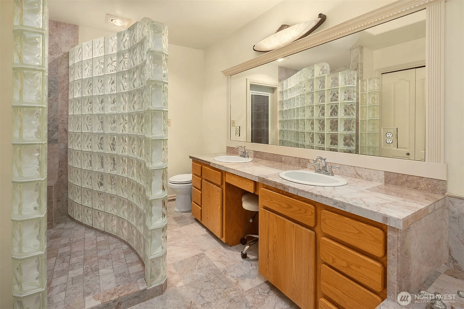 In the private en-suite bathroom, there’s an aesthetic you don’t see much anymore: one of another time, but with much charm. I love the slant of the bathtub and the shower’s glass brick wall! Beautiful.