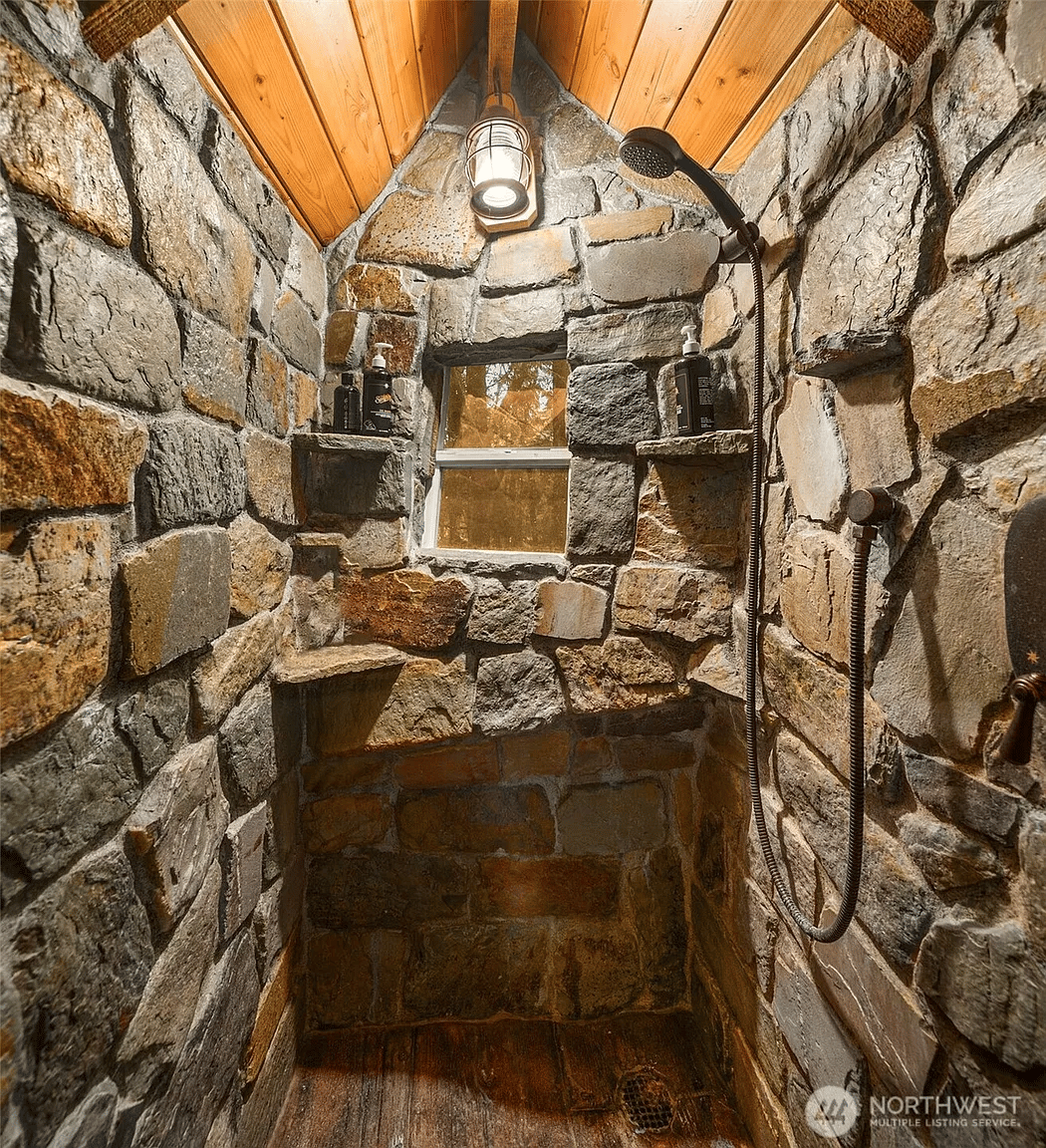 Climb up the ladder to the bedroom: nestled below the A-frame roof, there’s a bedroom perfect for snuggling up. And the bathroom… it’s kinda epic with the slanted window, rocky countertop, and a stonewall, lantern-lit shower.